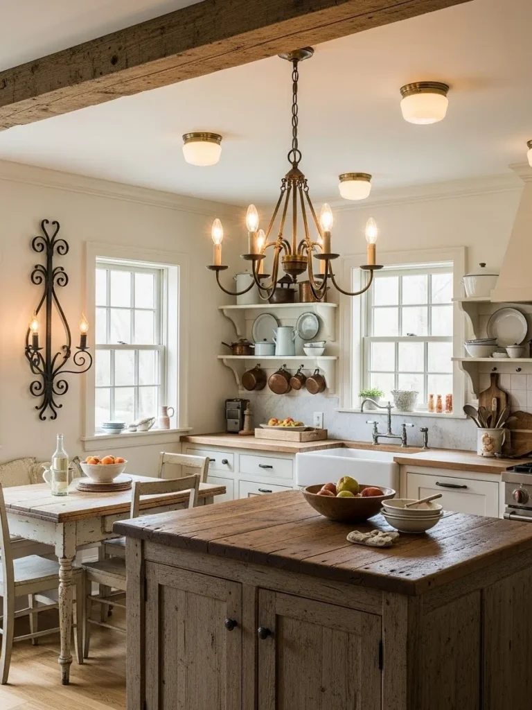 Farmhouse kitchens with antique lighting fixtures capture a unique blend of warmth, authenticity, and timeless appeal. Vintage chandeliers, lantern-style pendants, and weathered metal sconces add a sense of heritage that enhances the rustic charm of the space. These fixtures introduce character and a curated, collected-over-time aesthetic that defines true farmhouse style.