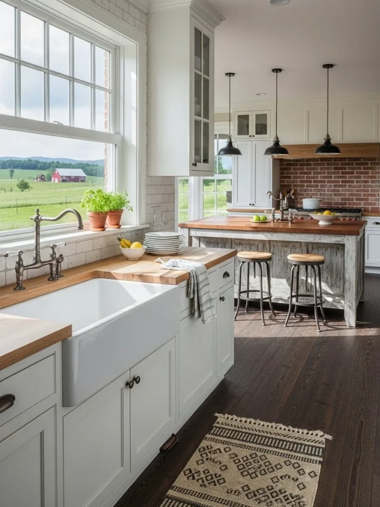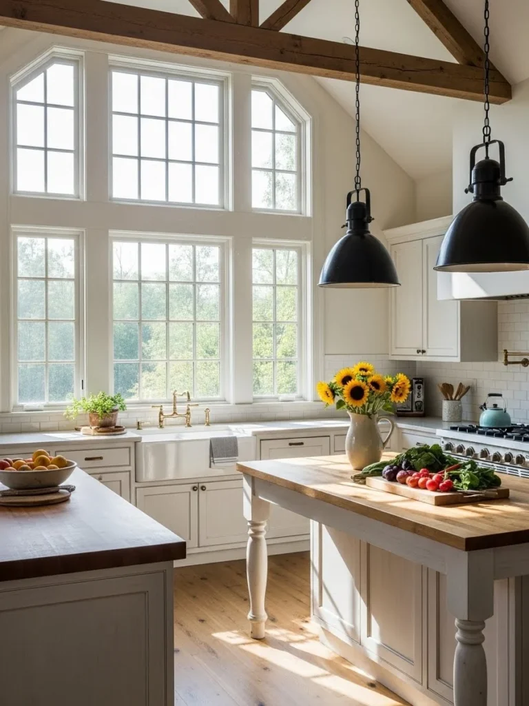 A farmhouse kitchen with oversized windows embraces natural light, creating a bright, open, and uplifting environment. Large windows frame outdoor views and allow sunlight to illuminate every detail—from rustic wood textures to ceramic accents. This design approach enhances the welcoming and airy atmosphere central to farmhouse aesthetics.