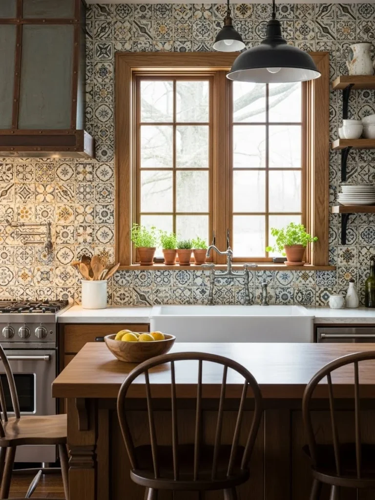 The combination of vintage tile with shaker cabinets, open shelving, and rustic wood surfaces enhances the kitchen’s farmhouse appeal. Soft color palettes and antique finishes pair beautifully with patterned tiles, creating a space that feels curated and timeless. This blend of old and new ensures harmony throughout the design.