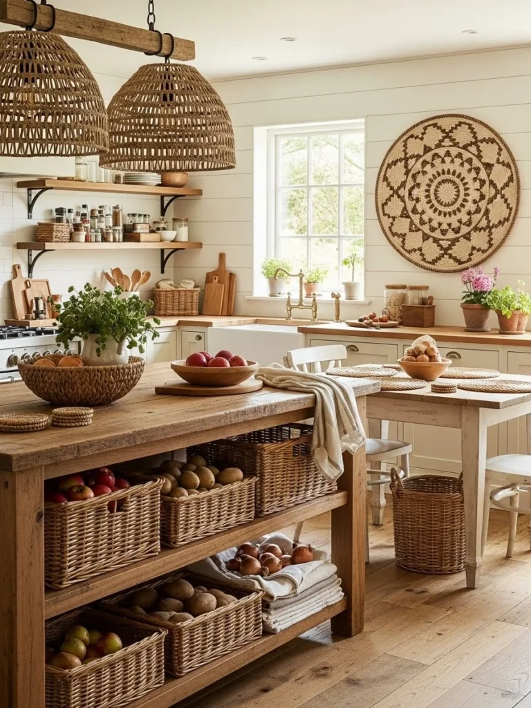 28. Farmhouse kitchen ideas with wicker baskets and woven décor