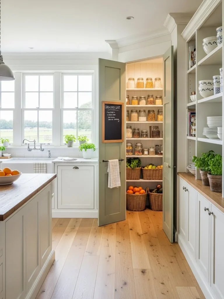 A farmhouse kitchen with a built-in pantry and storage wall combines charm with exceptional functionality. This design maximizes space while maintaining the warm, inviting atmosphere typical of farmhouse style. Tall cabinets, sliding doors, and thoughtfully designed shelving contribute to a seamless and organized kitchen layout.