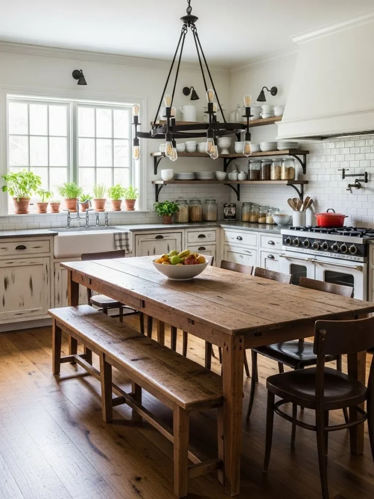 A farmhouse kitchen featuring a large wooden dining table embodies a warm and inviting atmosphere centered around gathering and connection. The substantial table often becomes the heart of the space, offering ample room for family meals, entertaining guests, and everyday activities. Its natural wood finish enhances the rustic charm characteristic of farmhouse design.