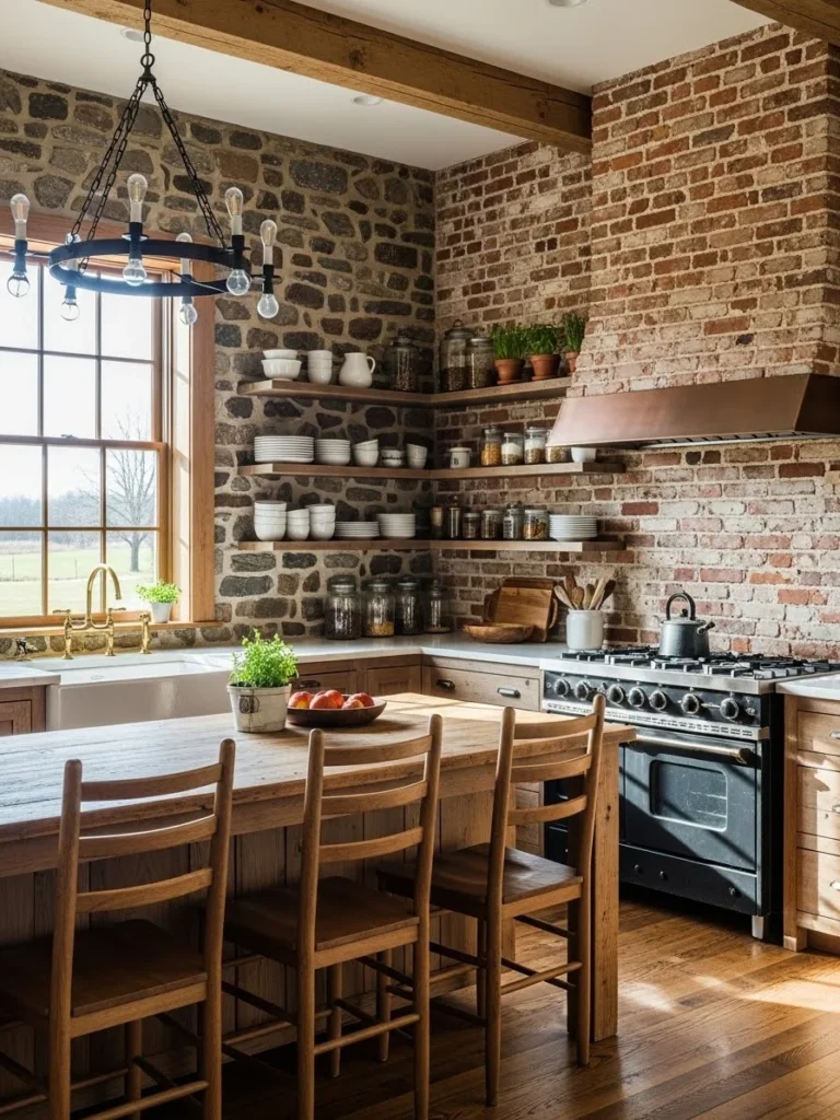 29. Farmhouse kitchen with stone or brick accent walls