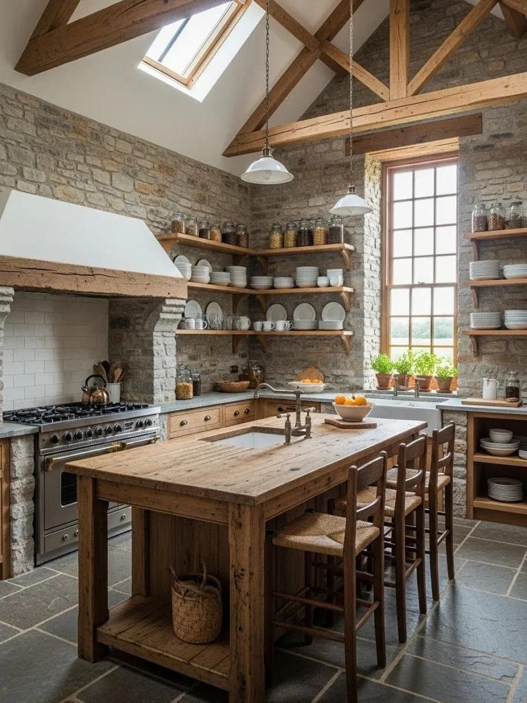 15. Farmhouse kitchen with stone walls and natural textures