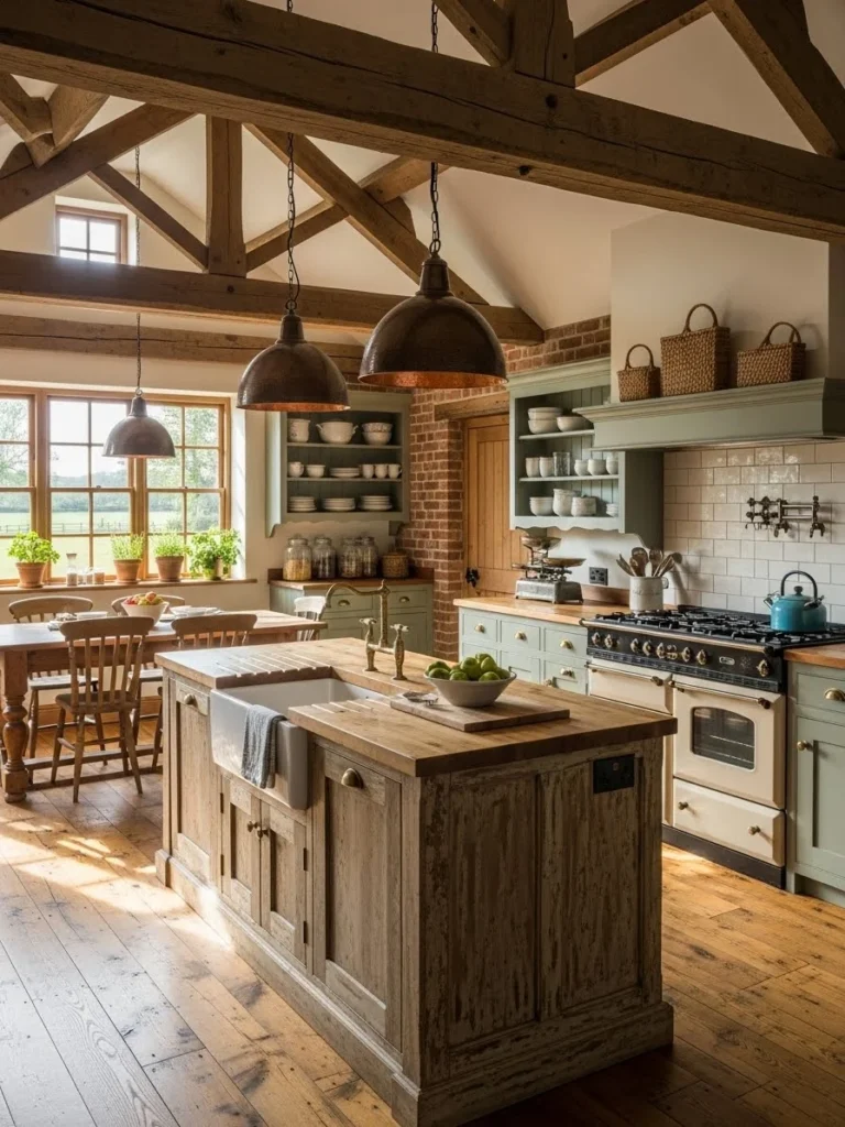 A rustic farmhouse kitchen with open-beam ceilings showcases the natural beauty of wood and adds architectural interest to the space. Exposed beams create an inviting, grounded atmosphere that highlights the historic charm associated with classic farmhouse design. They bring texture, warmth, and character to the kitchen, making the ceiling a standout feature.
