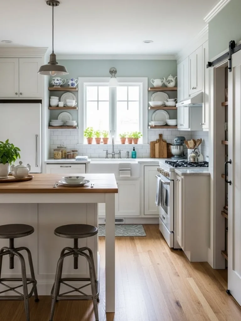 Light color palettes, natural materials, and simple cabinetry contribute to an open and airy feel. Incorporating multipurpose furniture, built-in organizers, and sliding barn doors further enhances usability. Even in smaller spaces, farmhouse elements like rustic wood accents or vintage hardware provide visual interest without overwhelming the room.