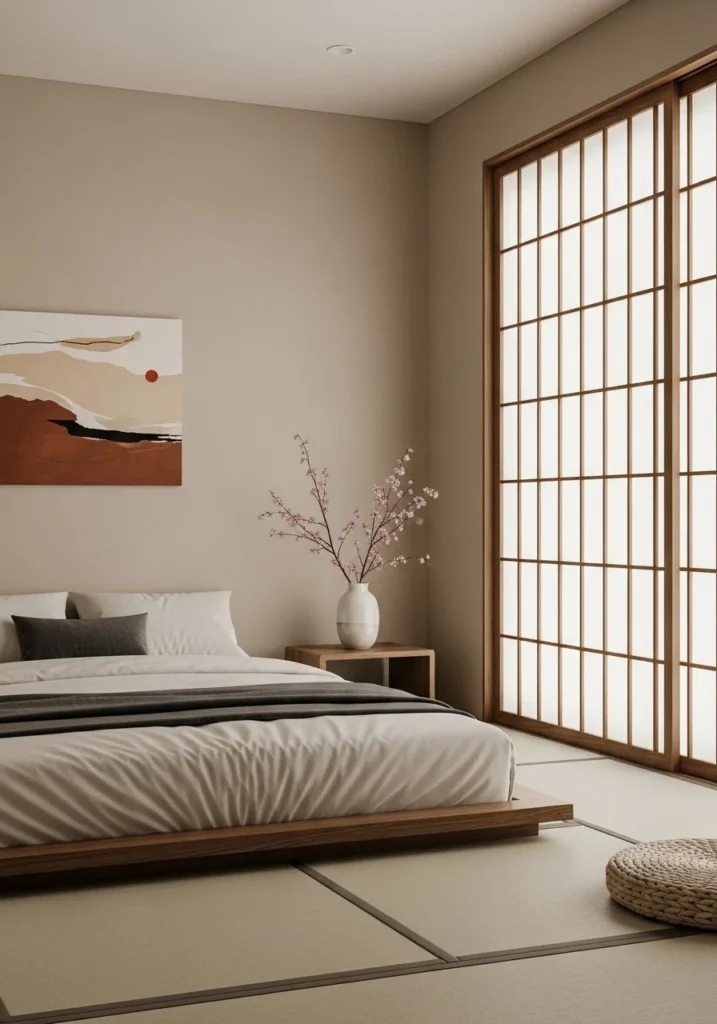 Natural materials are central to this design style. Bamboo, teak, and rice paper elements add warmth and texture while reinforcing the connection to nature. Low-profile beds or futons, along with tatami-style mats, enhance the minimalist aesthetic and provide a functional yet peaceful sleeping area.
