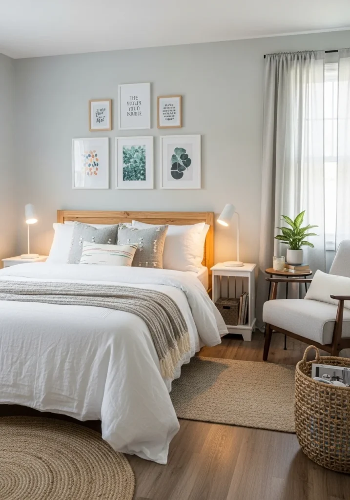 Light wood plays a key role in defining the Scandinavian aesthetic. Whether used in bed frames, dressers, or minimalist shelving, natural wood tones introduce warmth without overpowering the space. These materials combine beautifully with airy textures such as linen drapes, cotton bedding, and woven rugs, contributing to the room’s organic and relaxed atmosphere.
