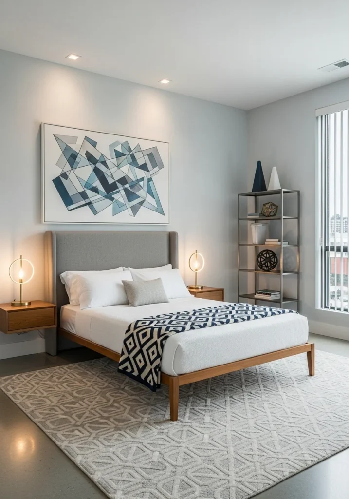 Contemporary guest bedroom with geometric decor elements