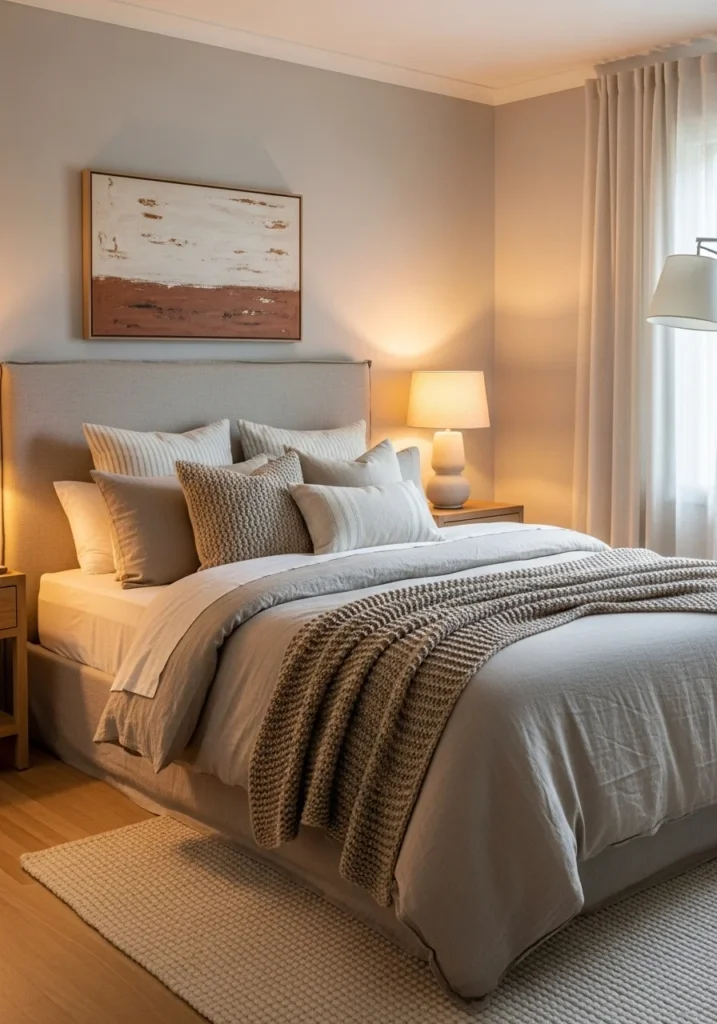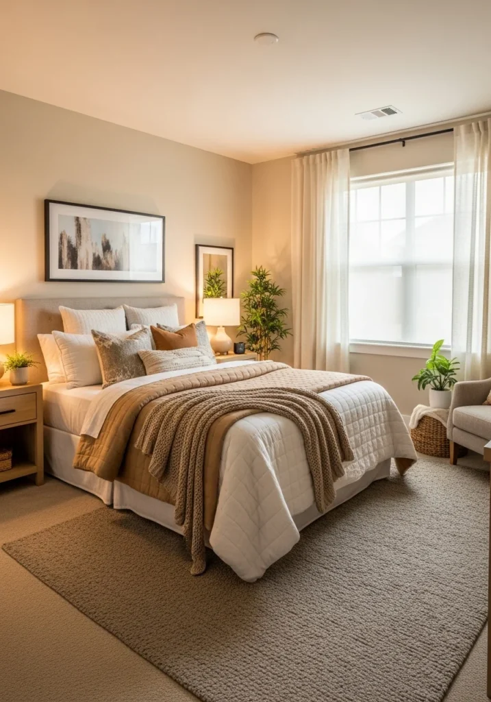 Cozy modern guest bedroom with warm neutral tones and soft layered bedding