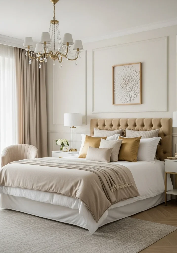 Elegant guest bedroom with gold accents and luxurious textures