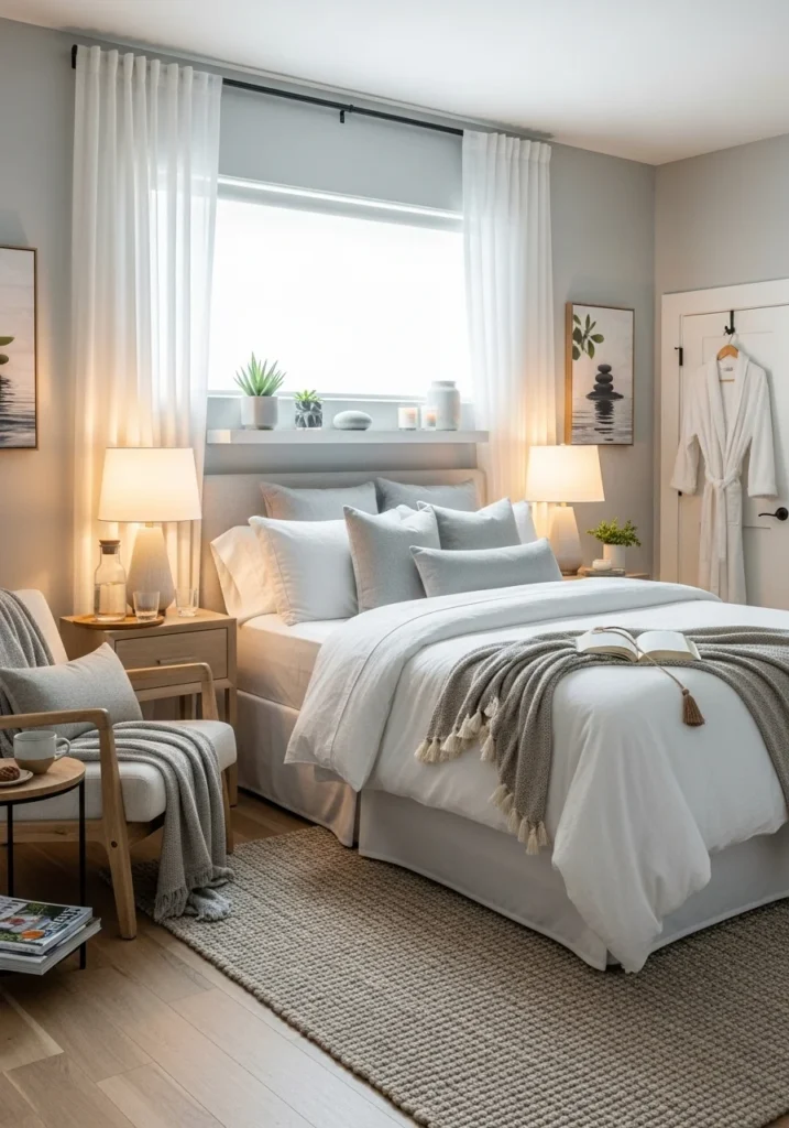 Thoughtful details complete the spa atmosphere. Adding aromatherapy diffusers, plush towels, or a cozy throw enhances comfort and elevates the guest experience. Simple greenery, such as eucalyptus or small potted plants, introduces nature and harmony. The result is a serene retreat where guests can unwind and enjoy a truly calming stay.