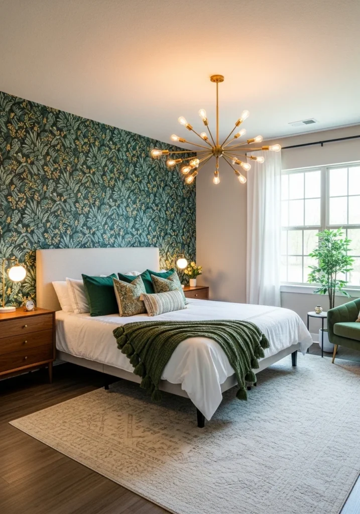Balancing strong visual elements with neutral furnishings ensures the room feels cohesive rather than overwhelming. Simple bedding, clean-lined furniture, and minimal accessories allow the wallpaper and lighting to shine. Soft textures and warm tones help ground the design, creating a refined and welcoming environment. Together, these elements produce a guest bedroom full of personality, style, and modern sophistication.