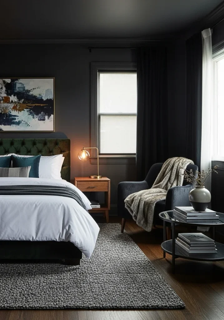 Moody décor elements enhance the dramatic aesthetic. Textures like velvet, suede, and matte finishes complement the dark walls, adding richness and dimension. Metallic accents in gold, brass, or black introduce subtle contrast and refinement. Artwork with deep hues or abstract themes further emphasizes the moody ambiance without overwhelming the space.