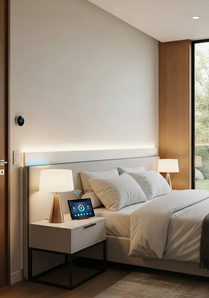 The room is completed with thoughtfully chosen bedding, lighting, and décor that reinforce comfort. Soft linens, layered textiles, and warm LED lighting maintain a relaxed ambiance, ensuring technology enhances rather than dominates the space. This blend of modern innovation and home-like comfort results in a refined guest bedroom that prioritizes ease and hospitality.