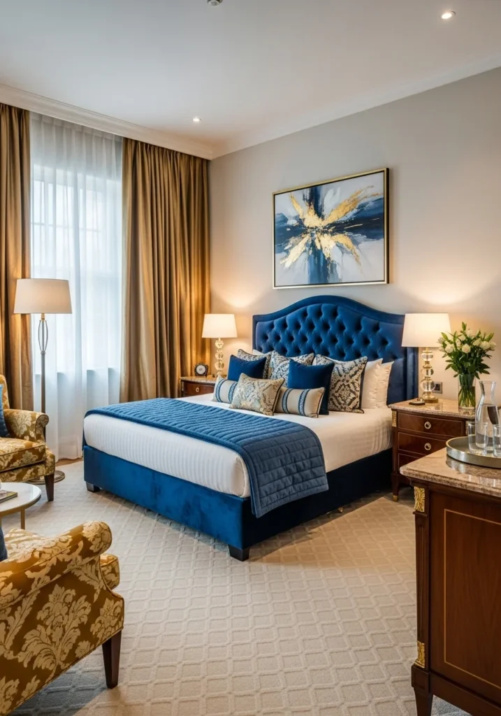 A luxurious hotel-style guest bedroom captures the essence of refined comfort and sophistication. The foundation of this look lies in a well-coordinated color palette, often featuring soothing neutrals, deep accents, and metallic touches. These tones set a polished atmosphere reminiscent of high-end hotels. High-quality finishes and uncluttered layouts further enhance the sense of luxury.
