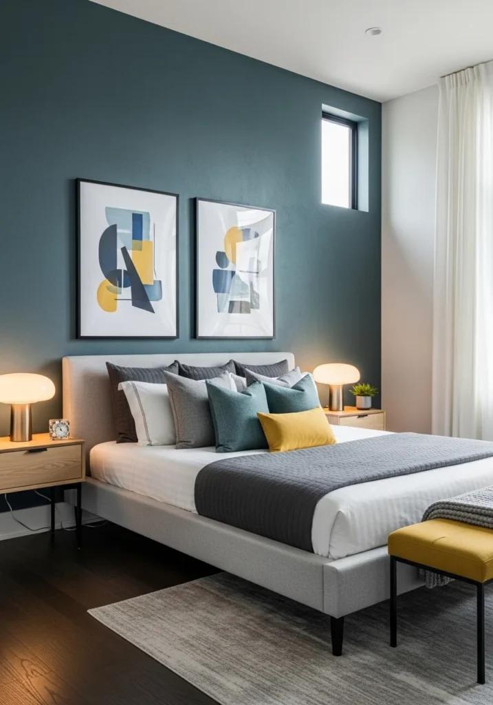 Modern guest bedroom with accent wall and contemporary art prints