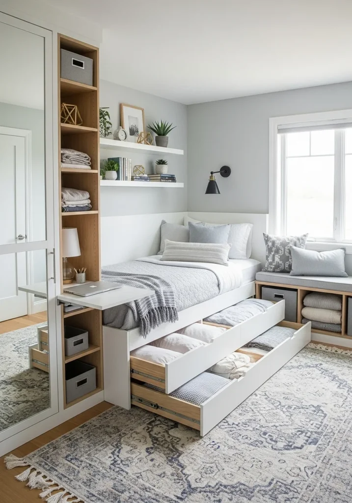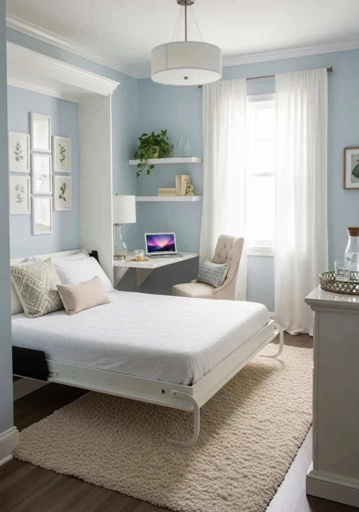 Guest bedroom with multifunctional furniture for small spaces
