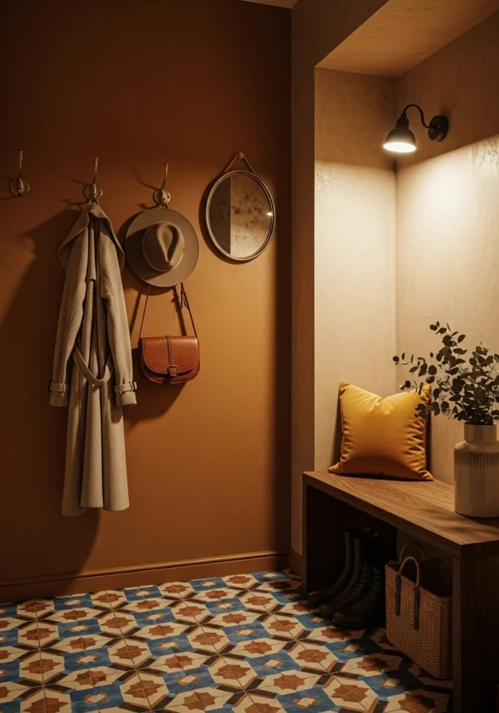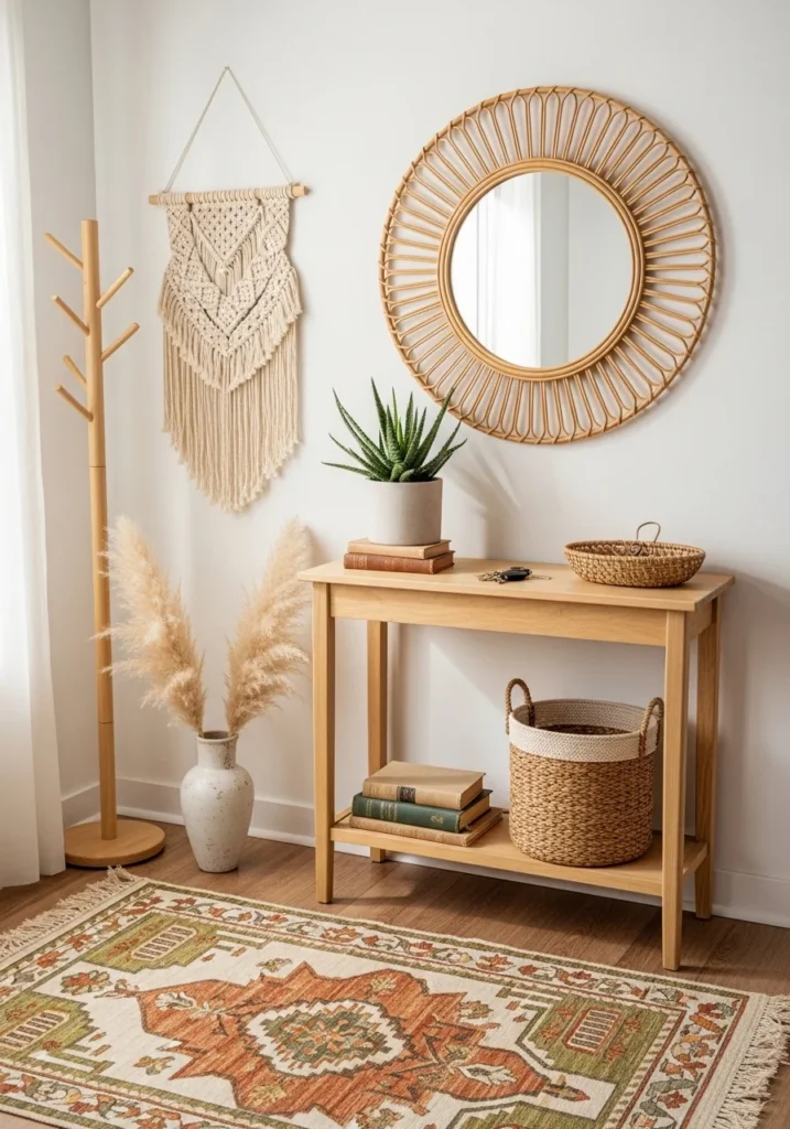 A patterned rug serves as the focal point of the boho design, grounding the space while adding color and personality. In a small entryway, a carefully chosen rug can create the illusion of depth and define the area without overwhelming it. Patterns inspired by global textiles, geometric motifs, or soft earth tones complement the rattan details and unify the overall look.