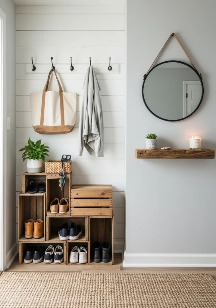 A budget-friendly small entryway highlights creativity and practicality through affordable, DIY-friendly solutions. Wooden crates serve as versatile storage pieces, functioning as shelves, cubbies, or benches depending on the configuration. Their natural texture adds warmth, while their modular nature allows homeowners to customize the arrangement based on space and needs. These crates offer a cost-effective way to create structure and organization in the entryway.