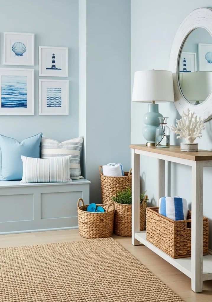 To complete the coastal style, layering simple accessories such as driftwood accents, seashell décor, or a nautical-striped rug adds personality without overwhelming the space. Light, natural fabrics and soft lighting contribute to the soothing atmosphere. Together, the gentle color palette and woven textures create a fresh, uplifting entryway that embodies coastal comfort in a compact footprint.