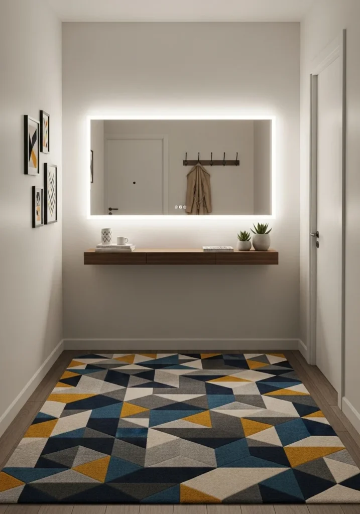 Balancing bold patterns and modern lighting with neutral walls and simple furniture ensures the entryway remains harmonious. A slim bench, clean-lined hooks, or a minimal console can complement the modern elements without overpowering them. Together, the geometric rug and LED mirror create a dynamic, stylish micro entryway that blends contemporary flair with everyday practicality.
