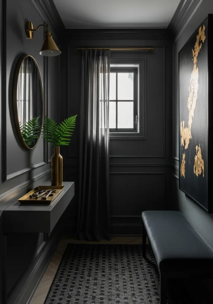 Dark and moody micro entryway with charcoal walls and brass accents