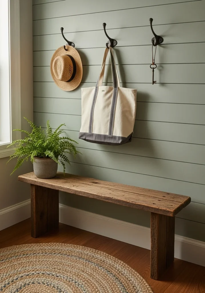 A farmhouse tiny entryway embraces rustic charm and timeless character through natural textures and cozy elements. A shiplap wall instantly sets the tone, adding warmth, depth, and a classic farmhouse aesthetic. Its horizontal lines help visually expand the narrow space, creating a sense of openness that balances the rustic feel. Painted in soft neutrals, shiplap enhances brightness while maintaining the relaxed, homey atmosphere.