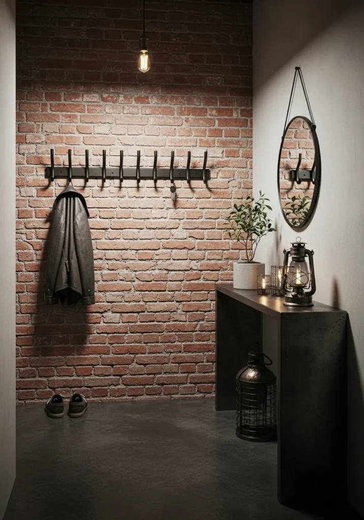 Metal hooks enhance the industrial aesthetic while offering essential functionality. Their sturdy, minimalist design provides a place for coats, bags, and accessories, keeping the space organized. Whether in black, iron, or brushed steel, the hooks complement the brick texture and contribute to the cohesive industrial look without overwhelming the small area.