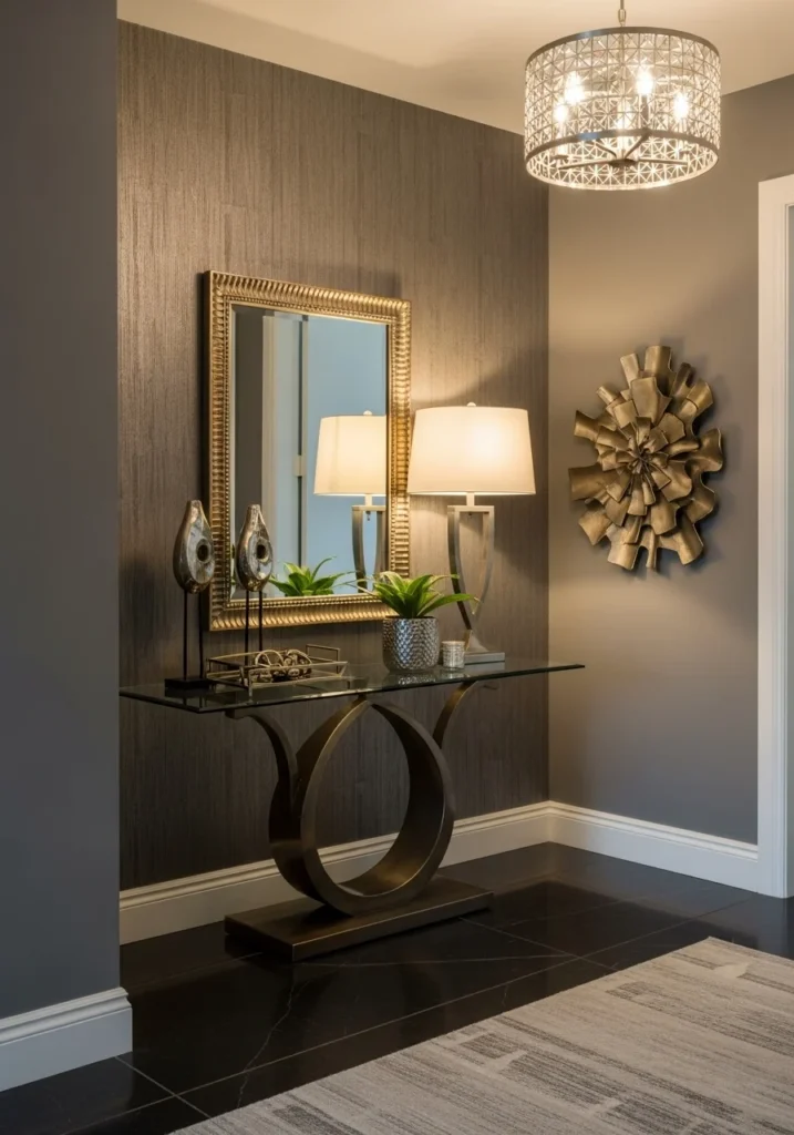 Luxury tiny entryway with glass console table and metallic accents