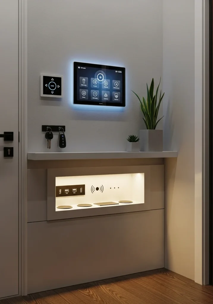 A micro entryway can become highly functional with the integration of modern smart technology. A smart home panel mounted at the entrance provides quick access to lighting controls, security systems, and climate adjustments. This creates a seamless transition as you enter or leave the home, giving the tiny space an elevated, contemporary feel. Despite its small footprint, the panel adds significant convenience and contributes to an organized, tech-forward entryway.