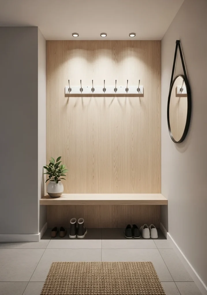 Sleek décor enhances the streamlined look. Minimalist wall hooks, slim lighting fixtures, and simple accessories contribute to a clean and modern aesthetic. By keeping the visual elements refined and purposeful, the entryway maintains an uncluttered appearance despite its limited footprint.