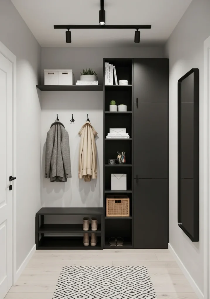 Balancing these elements with light-colored walls or natural textures ensures the space remains bright and welcoming. A narrow bench, simple artwork, or a small mirror can further enhance functionality while maintaining a cohesive style. Together, vertical storage and matte black accents create a refined, high-impact entryway that blends practicality with modern elegance, proving that even the smallest spaces can deliver strong design appeal.