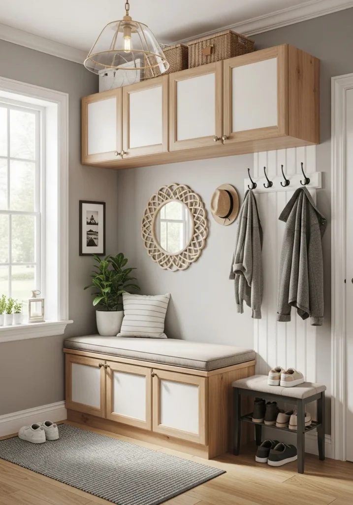 To maintain balance, incorporating soft colors and subtle décor helps prevent the area from feeling overly utilitarian. Cushions on the bench, a small rug, or minimal wall art add warmth and personality without interfering with the space’s functionality. The combination of built-in seating and overhead storage creates a highly practical and polished entryway that supports everyday living with ease.