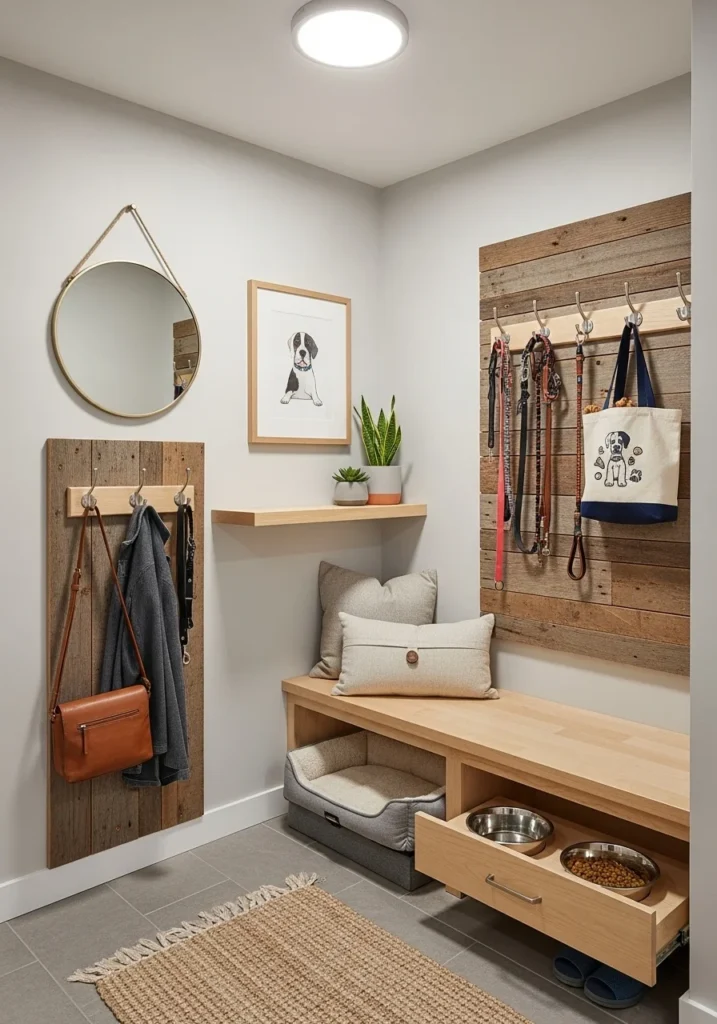Pet-friendly micro entryway with built-in dog storage and hooks