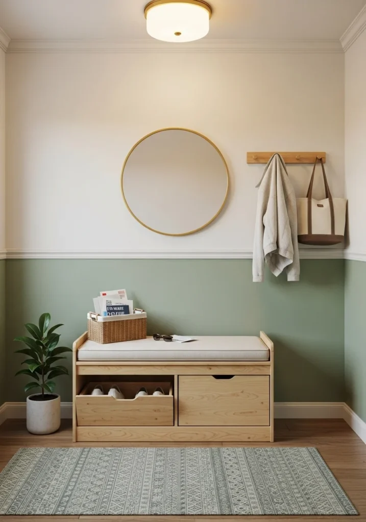 Small entryway with two-tone walls and compact storage bench