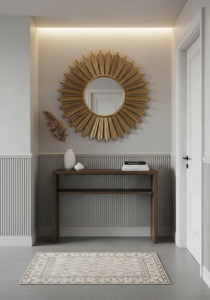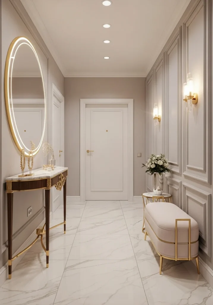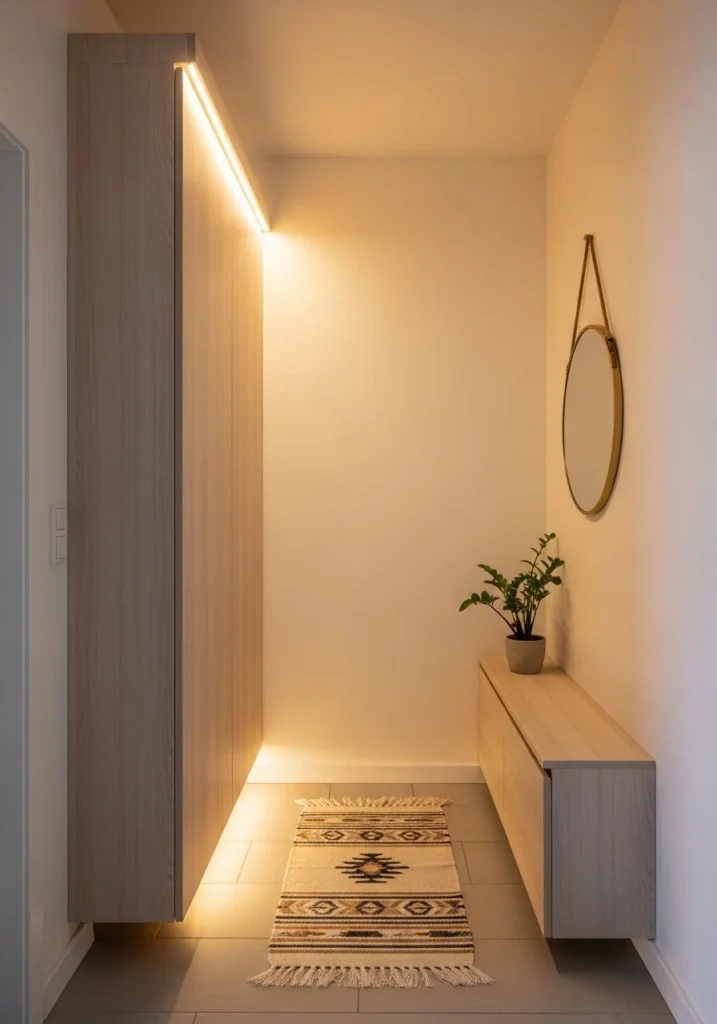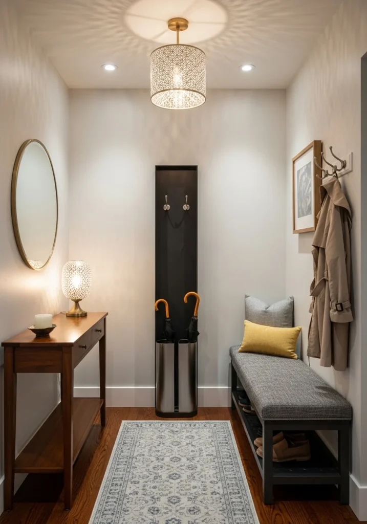 Minimal décor, a narrow runner, and a small mirror finish the design elegantly. The layered lighting becomes the standout feature, ensuring the entry feels welcoming even with limited natural light. This design suits apartments and homes where every inch matters, offering both style and thoughtful usability.