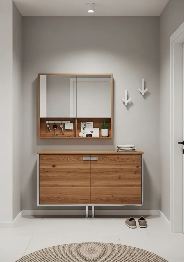 A compact mirror with integrated storage adds both efficiency and style. Mirrors naturally expand visual space by reflecting light, while the hidden storage compartments keep essentials neatly tucked away. This dual-purpose design helps maintain a clean, organized entryway where every item has its place. The mirror also serves as a quick grooming checkpoint before heading out the door.