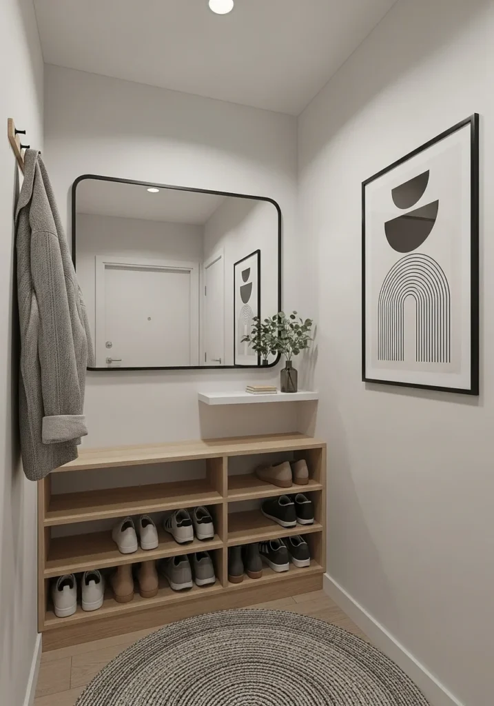 To complete the layout, a narrow console, small plant, or soft runner can provide subtle additional details without disrupting the minimal aesthetic. Neutral tones and streamlined forms help maintain openness, making the tiny entryway feel bright and welcoming. Together, the shoe cubbies and minimalist art create a polished, efficient entry space tailored for apartment living.