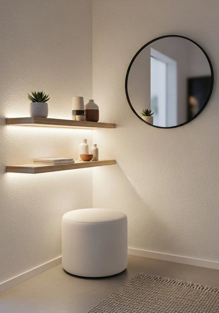 Ultra-compact entryway with minimalist floating shelves and soft ambient lighting