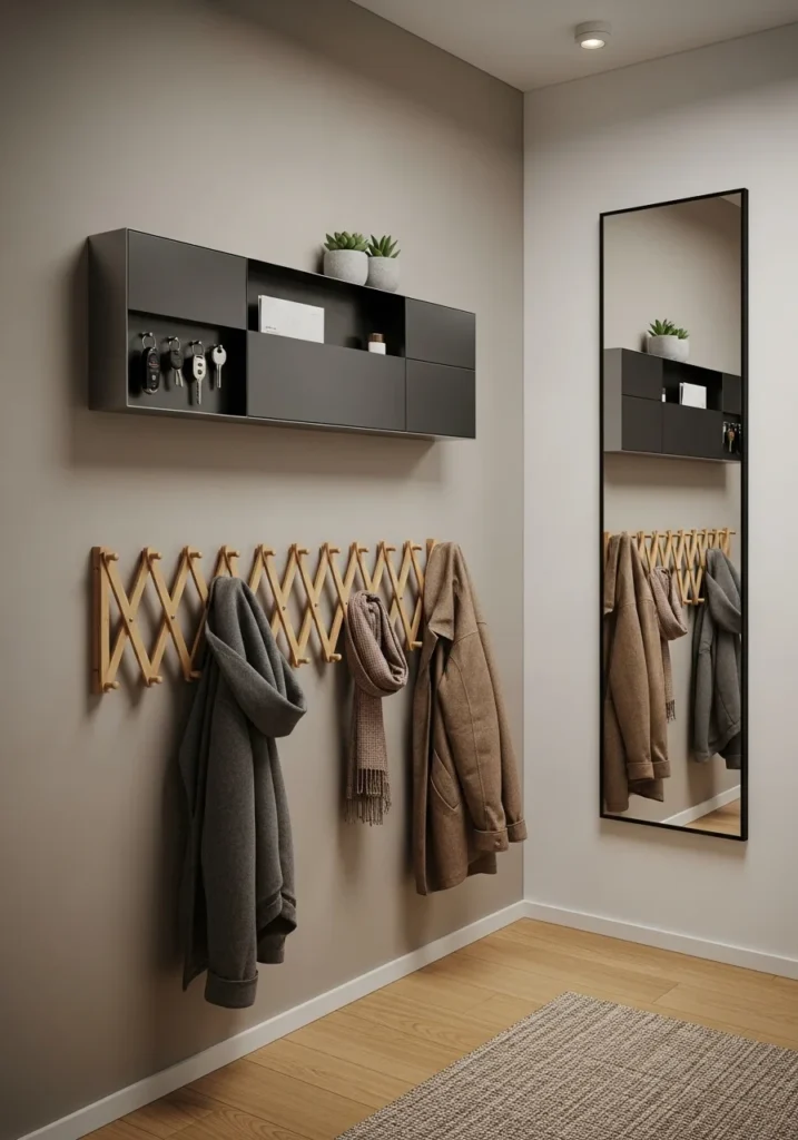 Ultra-slim entryway with accordion coat rack and wall-mounted organizer