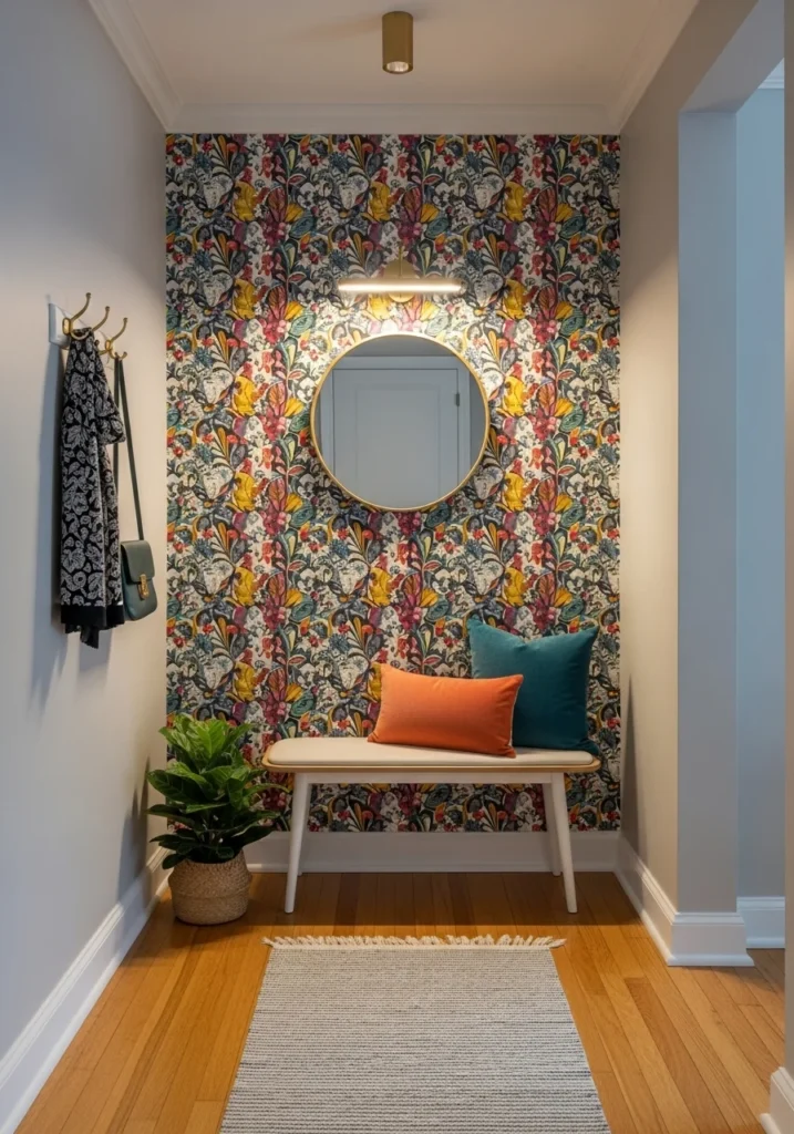 Very small entryway with bold wallpaper accent and slim bench