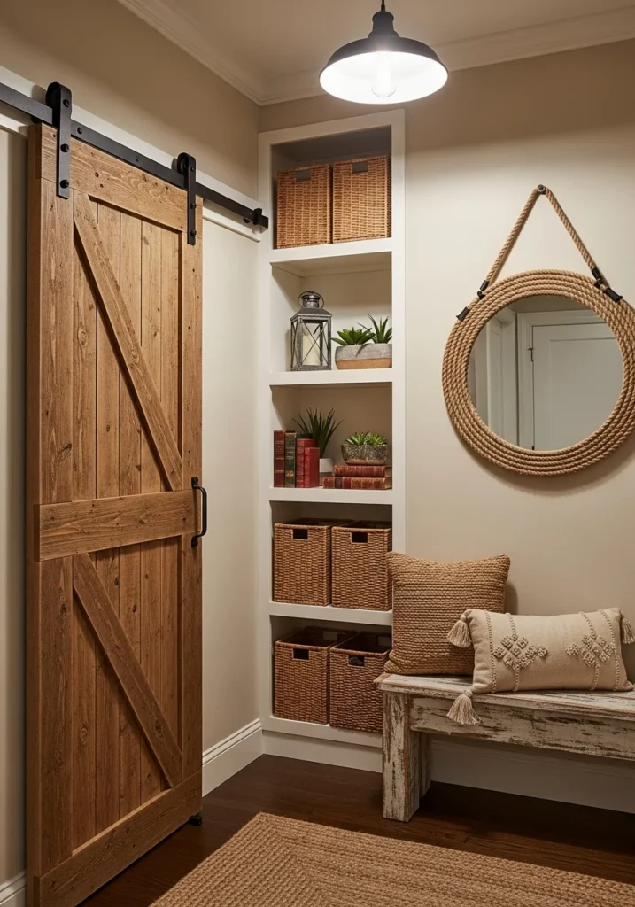 To maintain balance, pairing rustic textures with neutral walls and simple lighting prevents the space from feeling too busy. A woven rug, small bench, or minimal greenery can soften the look while preserving the rustic atmosphere. Together, the barn door storage and rustic décor create a highly functional entryway that exudes charm, practicality, and timeless character.