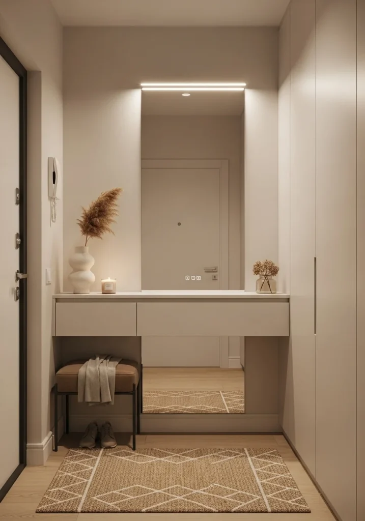 Soft lighting, neutral wall colors, and a slender floor runner complete the entryway without adding bulk. With minimal décor and smart organizational elements, the space remains elegant and efficient. This design is perfect for apartments with limited room and for individuals who appreciate sleek, contemporary solutions.