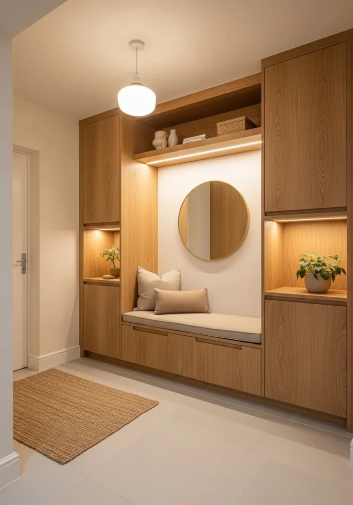 Ambient lighting, a sleek mirror, and minimal décor complete the space, offering both function and calm. The combination of warm wood and gentle neutrals creates a serene transition into the home, making the small entryway feel welcoming and polished. This design is ideal for those who appreciate understated sophistication.