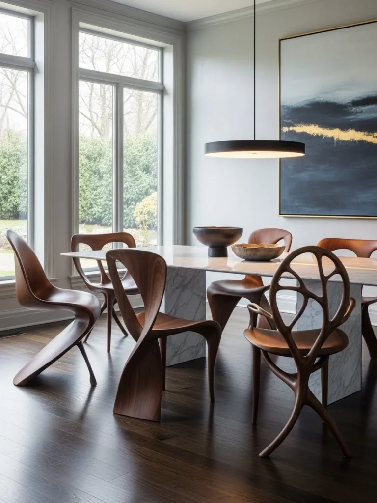 Artistic sculptural dining chairs function as both functional seating and bold decorative statements. Featuring creative shapes, geometric forms, or unique materials, these chairs transform the dining room into a visually engaging space. Their sculptural design adds personality and can serve as a conversation starter during gatherings.