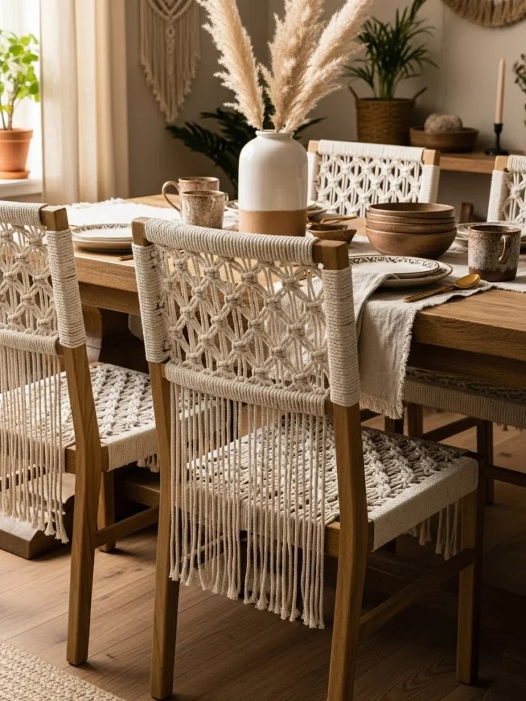 Bohemian dining chairs with woven macrame seats bring artisanal charm, texture, and visual interest to the dining room. The intricate macrame weaving adds a handcrafted, organic feel, creating a relaxed and inviting atmosphere. These chairs are perfect for homeowners seeking a cozy, eclectic, or globally inspired aesthetic.