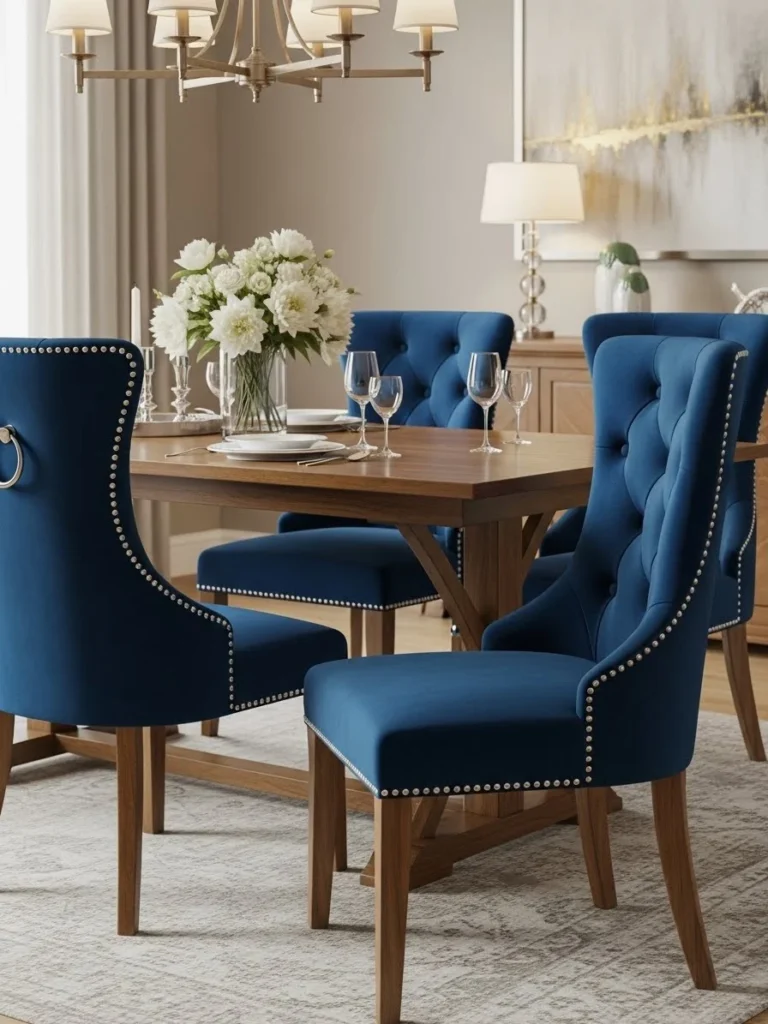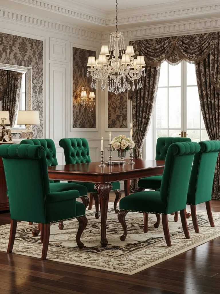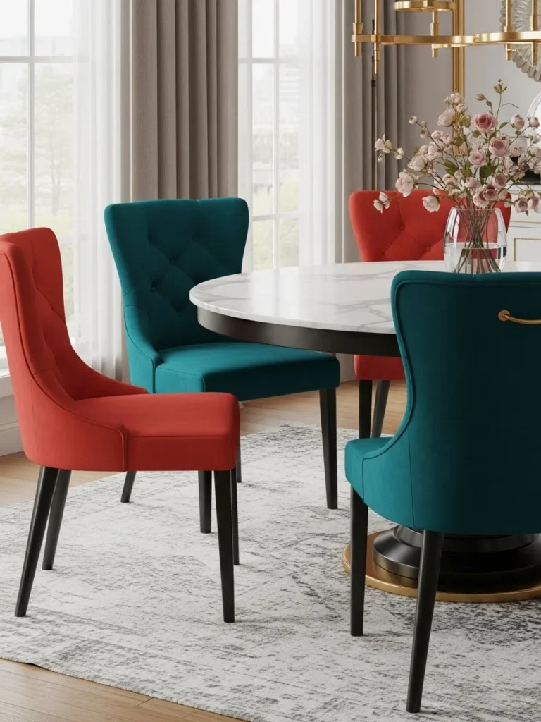 Bold-color dining chairs in jewel tones make a striking statement in any dining room. Vibrant hues such as emerald, sapphire, ruby, or amethyst create visual drama while adding warmth and personality to the space. These chairs serve as focal points, drawing attention and elevating the room’s design.