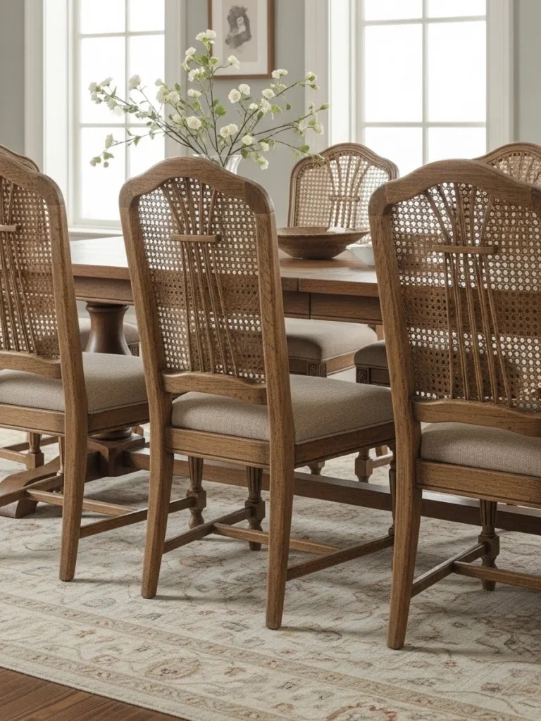 Ideal for traditional, farmhouse, or eclectic interiors, cane-back dining chairs add character and sophistication to the dining space. Their vintage appeal makes them a standout feature, while their neutral palette ensures compatibility with various table styles. These chairs create a warm, inviting environment for both casual meals and formal gatherings.