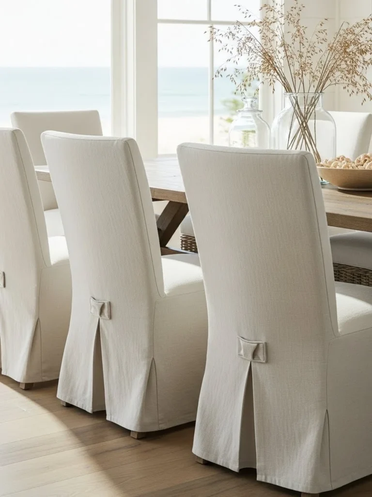 Coastal-style dining chairs with linen slipcovers create a relaxed, breezy, and elegant dining atmosphere. Linen fabric adds texture and softness while evoking a natural, coastal-inspired aesthetic. Slipcovers offer versatility, easy maintenance, and a casual charm that complements light, airy dining rooms.